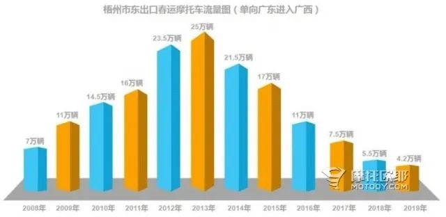 在这种氛围的影响下,骑摩托车返乡的人数一年比一年多,2013年就有25万台摩托车从广东单向进入广西,大家都以为2014年摩托车返乡人数会再创辉煌,可实际情况却是摩托车返乡人数自2013年后便逐步减少……到了2019年,从广东到广西的摩托车返乡大军整整减少了20万辆车。