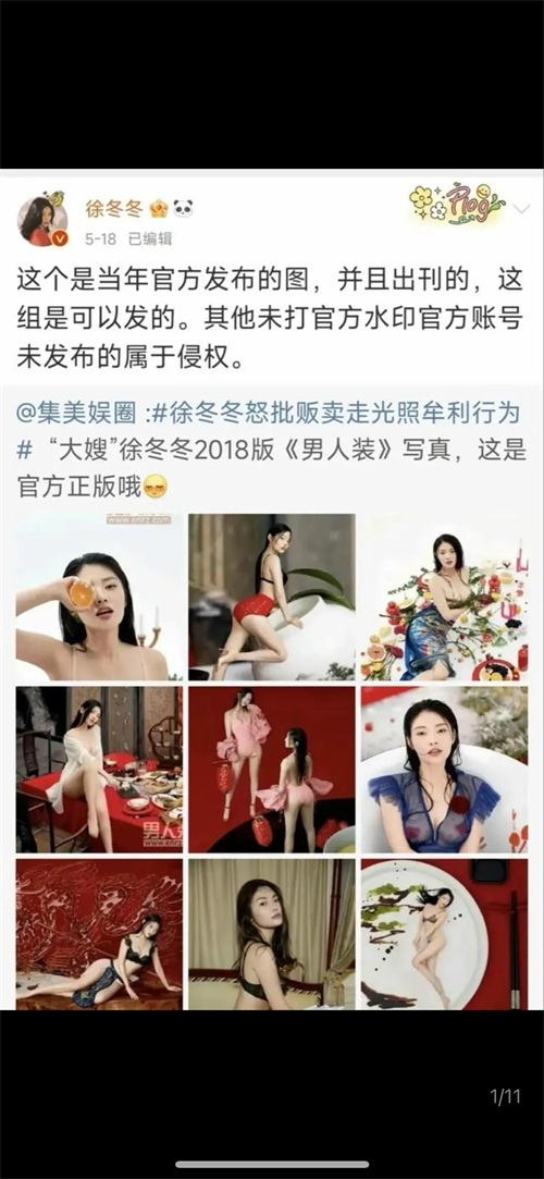 5月18日,徐冬冬在社交平台上公布,自己拍摄《男人装》的隐私照,被不法分子拿来在网络上公开售卖,在网络上引起热议。