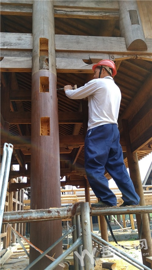 近日,岳阳日报全媒体记者在屈子祠文化园的屈子书院看到,书院的框架已经基本架好,几名木工师傅正在全木质结构的框架上一锤一凿地精心敲打着木栓接口。