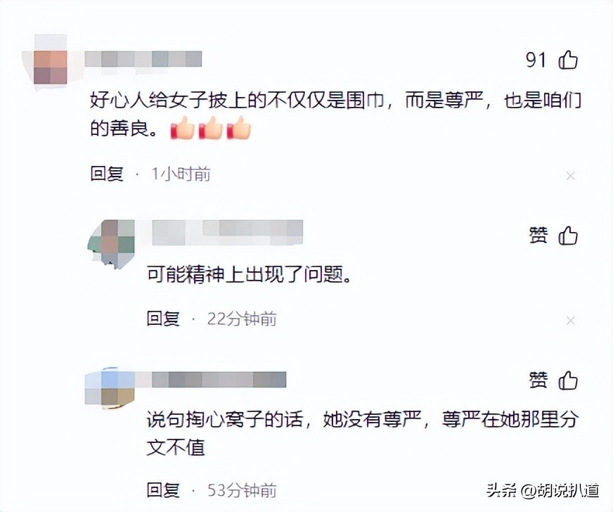 那些善良人士提供的不仅是一条围巾,更是对街头无助女子尊严的维护和尊重。这种温暖人心的善意,值得我们给予高度赞扬和认可。
