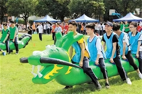 两组游客竞赛,坐在充气龙舟上,将龙舟划到指定,优先达到的获胜。