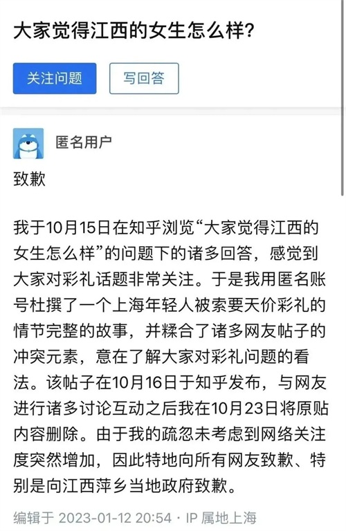 不久前上海一网友发文说,他江西萍乡的前女友索要1888万元彩礼,最后他提了分手。原帖说:“我心里预算是彩礼给百万现金。”参与该事件调查的一位人士表示,根据出入境情况核查,初步判断该文章内容系杜撰。一位ip属地是上海的匿名用户道歉说,他是“糅合了诸多网友帖子的冲突元素,意在了解大家对彩礼问题的看法”。