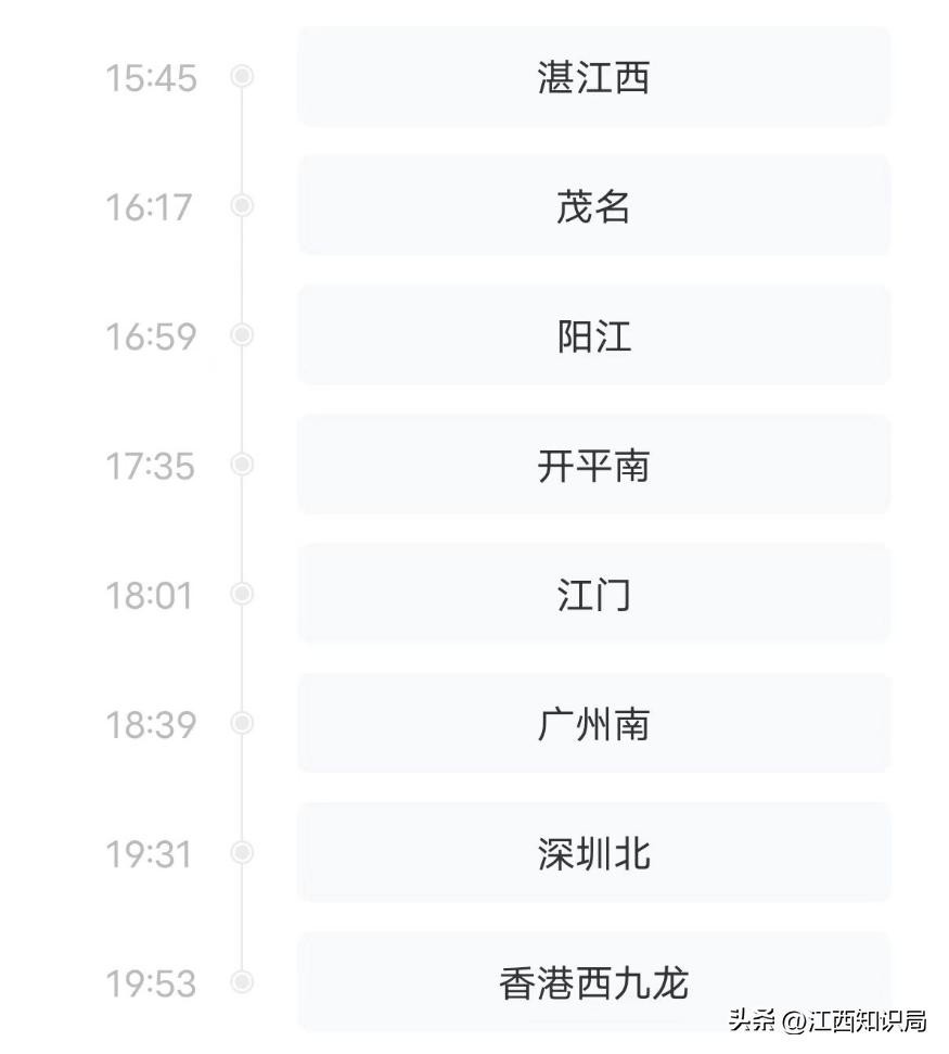 本次列车15:45从湛江西出发,19:53到达香港西九龙,中间一共停靠6站(详情见图),全程564公里,运行时长4小时8分钟。列车由广州局广九段担当,型号为复兴号CR400AF-2051/1021型重联动车组。