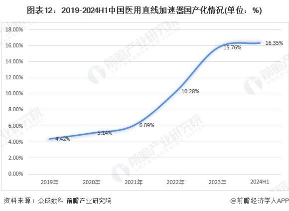 对于医用直线加速器设备来讲,国外公司起步较早,发展较快,以医科达、瓦里安为代表的放射性治疗设备(放疗设备)厂商的技术开发、行业产品应用时间相较于国内厂商更长,进口厂商的技术积累和行业市场份额均处于领先地位。虽然目前国内医用直线加速器市场仍主要由进口品牌所把控,但近年来中国企业后起之秀崭露头角,行业国产化率呈现明显的上升趋势,从2019年的4.42%增长至2024年上半年的16.35%,国产医用直线加速器在国内的市场接受度与竞争力日益增强。