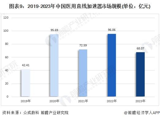 据众成数科数据分析,2019年我国医用直线加速器市场规模达到42.41亿元,2020年增长较快,达到95.69亿元,2020年至2023年三年间,受疫情及核技术发展影响,市场规模略有浮动,2023年达到68.07亿元,但根据技术发展趋势及国家政策扶持影响而判断,我国医用直线加速器市场规模整体呈波动增长趋势。