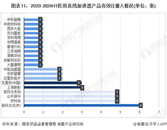 从产品注册人的获批数量来看,2020年至2024年上半年,有效产品注册共43个,进口品牌医科达、国产品牌安科锐和山东新华医疗的注册数量高于其他企业,三家品牌合计获批数量占整体数量的47.7%。其中,医科达共持有6张医用直线加速器注册证,排名第一。