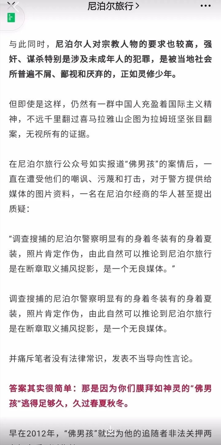 有一个公众号“尼泊尔旅行”的近日发布的文章里如实报道了拉姆班坚畏罪潜逃的事,却遭到许多人的攻击和谩骂。