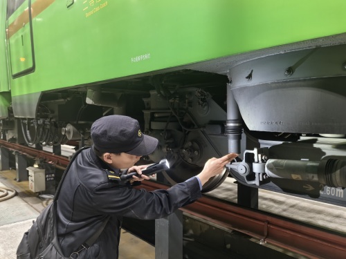 出乘手续办理完毕后,肖磊走出调度室,背着工具包来到动集四线库,开始对即将出发的列车进行出库前的全面检查。从车头到车尾,再沿着另一侧折返回来,不留任何死角,肖磊手持检测设备,仔细检查列车每一个机械部件,无论是制动系统、空调,还是车门、信号设备逐一确认,确保设备全部正常运行。