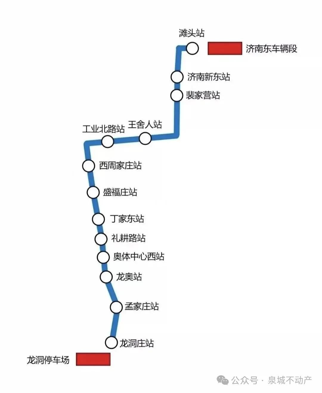 线路全长21.6公里,13个特色车站自南向北依次是龙洞、孟家庄、龙奥大厦、奥体中心、礼耕路、丁家庄、花园东路、张马屯、八涧堡、王舍人、裴家营、济南东站、滩头。