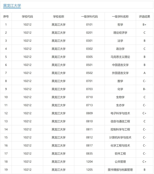 理工科不够出众的有力证明,莫过于第四轮学科评估的结果:黑龙江大学外国语言文学学科评为A类,哲学学科评为B+类,法学、中国语言文学、马克思主义理论、图书情报与档案管理4个学科评为B类,化学学科评为B-类,电子科学与技术、公共管理2个学科评为C+类,理论经济学、政治学、生物学、信息与通信工程4个学科评为C类,数学、生态学、控制科学与工程、计算机科学与技术、软件工程、化学工程与技术6个学科评为C-类。
