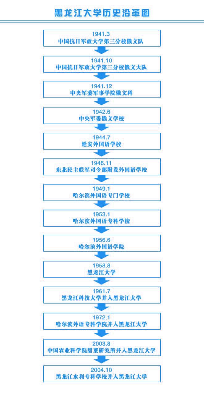 根据多数朋友的阅读习惯,还是先来一张历史沿革图,让大家看看黑龙江大学从何而来。