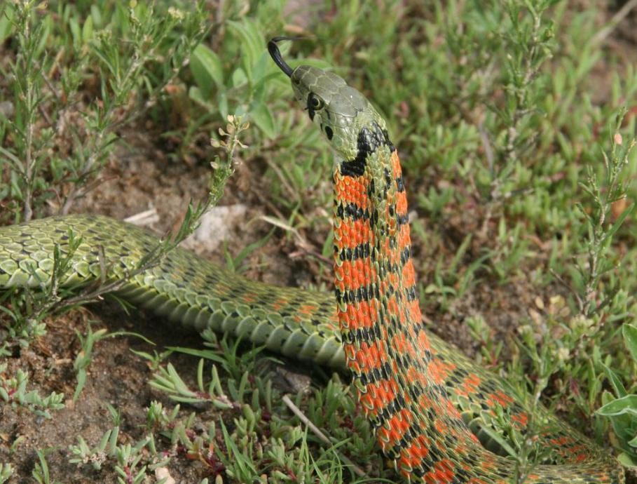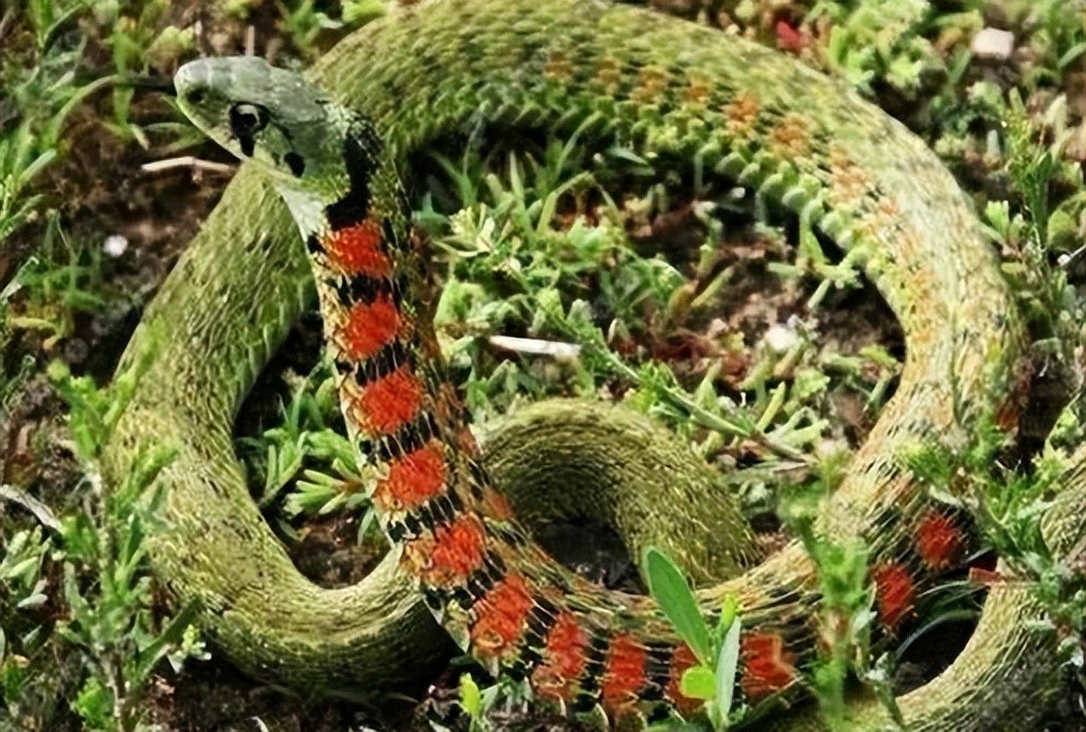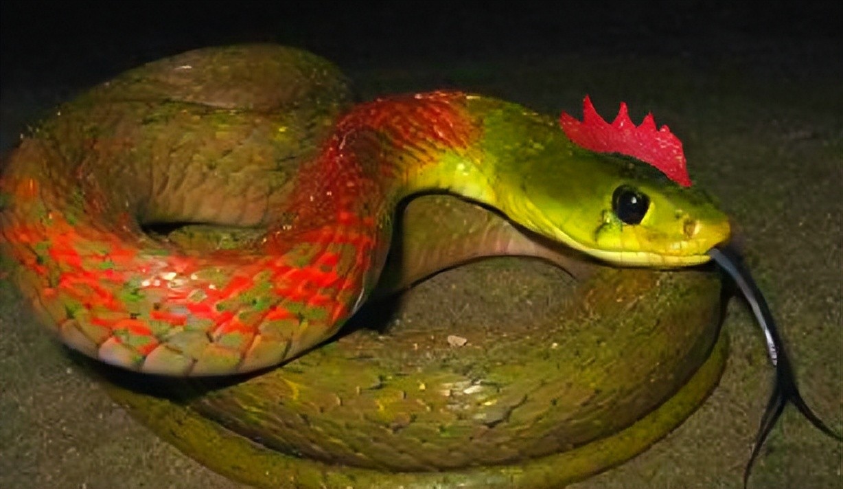 但在现实中,被称为“鸡冠蛇”的原型其实是虎斑游蛇。这种蛇的背部有一条红色花纹,当它受到威胁时,这条红色花纹会像鸡的鸡冠一样竖起。
