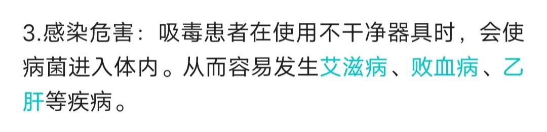 感染危害:吸毒患者在使用不干净器具时,会使病菌进入体内。从而容易发生艾滋病、败血病、乙肝等疾病。