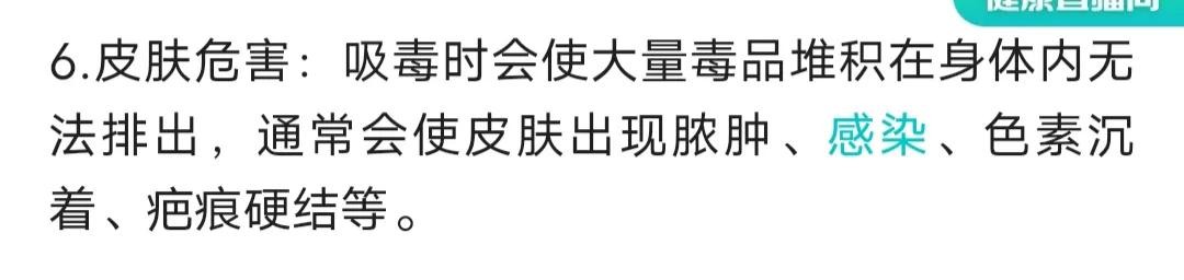皮肤危害:吸毒时会使用大量毒品堆积在身体内无法排除,通常会使皮肤出现脓肿,感染,色素沉积,疤痕硬结等。