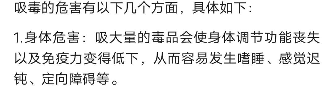 身体危害:吸大量的毒品会使身体调节功能丧失以及免疫力变得低下,从而容易发生嗜睡、感觉迟钝、定向障碍等