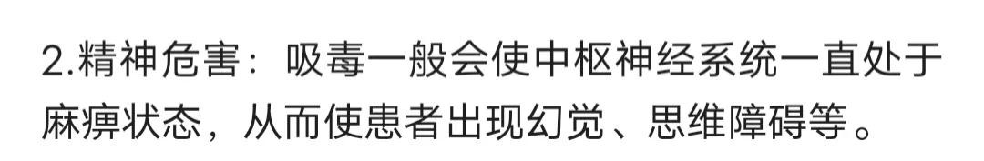 精神危害:吸毒一般会使中枢神经系统一直处于麻痹状态,从而使患者出现幻觉、思维障碍等。