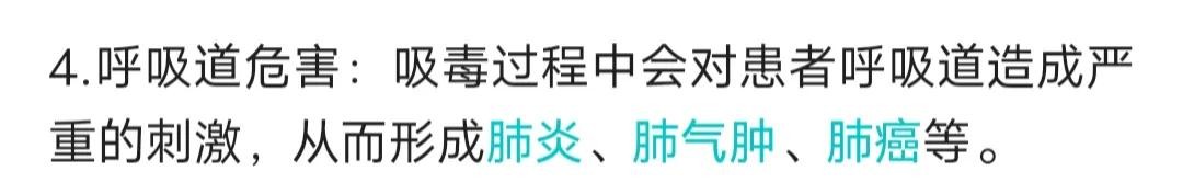 呼吸道危害:吸毒过程中会对患者呼吸道造成严重的刺激,从而形成肺炎,肺气肿,肺癌等。