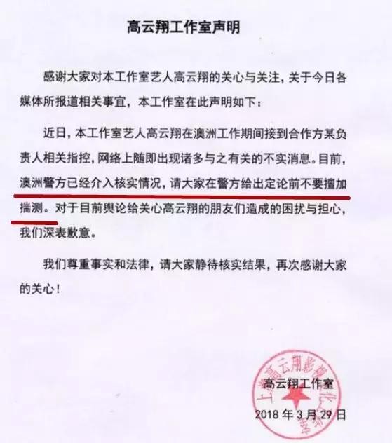 事情走向到现在,高云翔工作室那边也表态了,发声明表示,静待警方结果。