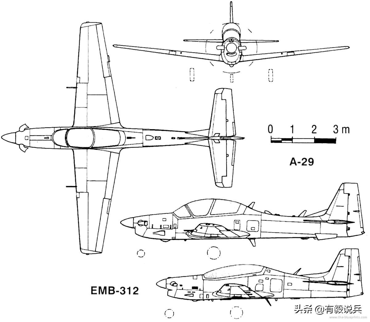 EMB-312“大嘴鸟”教练机和A-29轻型攻击机的同比例线形图