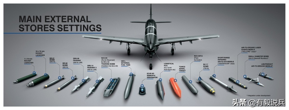 A-29“超级大嘴鸟”轻型攻击机外挂武器包括多型直瞄武器、航弹、对地和对空的精确制导武器