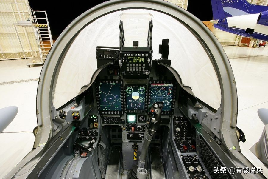 超级大嘴鸟”轻型攻击机的飞行员席和操作仪表板,采用“一上(抬头显示器)三下(平面显示器)”的标准配置