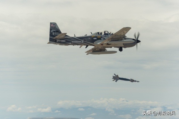 EMB-314“超级大嘴鸟”轻型教练攻击机挂载2个副油箱和1枚半主动激光制导炸弹,即可对数百千米以外的点目标发起远程奔袭和精确打击
