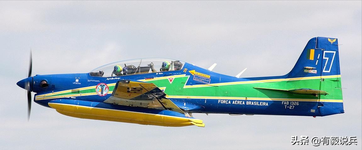 巴西空军纪念T-27初级教练机服役30年涂装,乘员2名,机长9.86m,翼展11.14m,机高3.4m,机翼面积19.4m2,空重1810kg,最大起飞重量3175kg,载弹量1000kg,最大飞行速度458km/h,巡航速度441km/h,航程1916km,升限8750m,滞空时间9h;视野好的流线形整体式座舱盖有较强的现代感