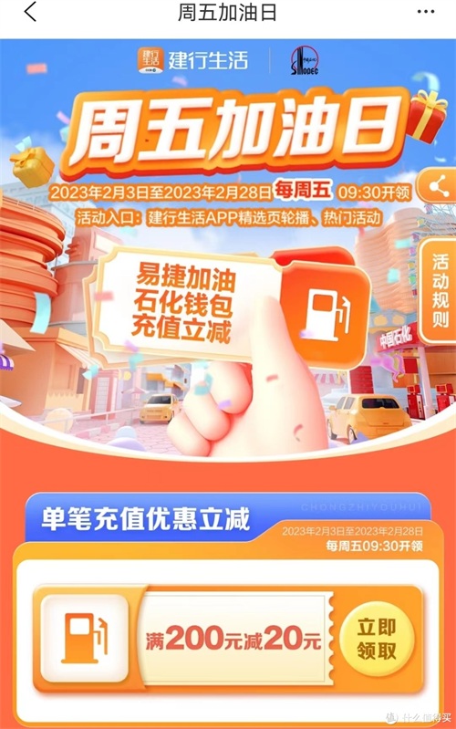 建行生活App首页--精选页轮播或热门活动栏目找到“周五会员日”活动,每周五上午9:30起,可限量领取中石化钱包充值满200减20元优惠券。每个活动日额度35000张,活动期间每个用户限参加1次。