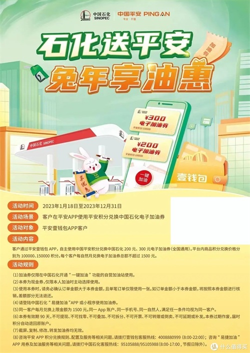1、2023年1月18日至12月31日,平安壹钱包APP客户通过平安壹钱包APP使用积分兑换中国石化200元、300元电子加油券,每个客户每自然月兑换电子加油券总额不超过1500元,有效期90天。