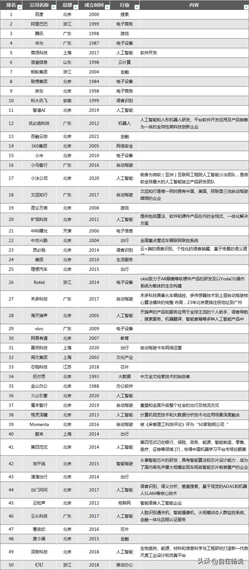 最新发布,中国人工智能公司50强,前四名北、粤、沪、浙占比92%