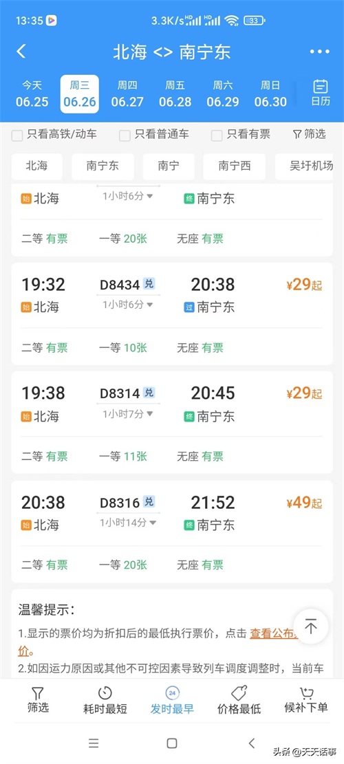 不过现在有好消息,广西最近的动车票价出现了不少白菜价,价格低到惊人。这两天准备出门走走,就查询了有关动车信息,这一查才发现,现在北海至南宁东的动车票,最低只要29元,没有错30元都不到的价格,堪称北海至南宁历史最低的动车票价。这些白菜价的动车票,主要是在周一到周四的时间段,周五至周六的时间段没有,不过周末有49元的二等座,也是比较便宜了。但是只有单程优惠,南宁到北海没有这么便宜。