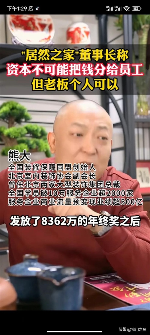 其实汪总的话糙理不糙,除了胖东来确实没有几个资本家把利润95%分给员工。居然之家汪总也是个不错的人,他认为老板个人可以拿出钱给员工,但不能动用公司利润。今年他自己拿出8000多万给员工发福利。