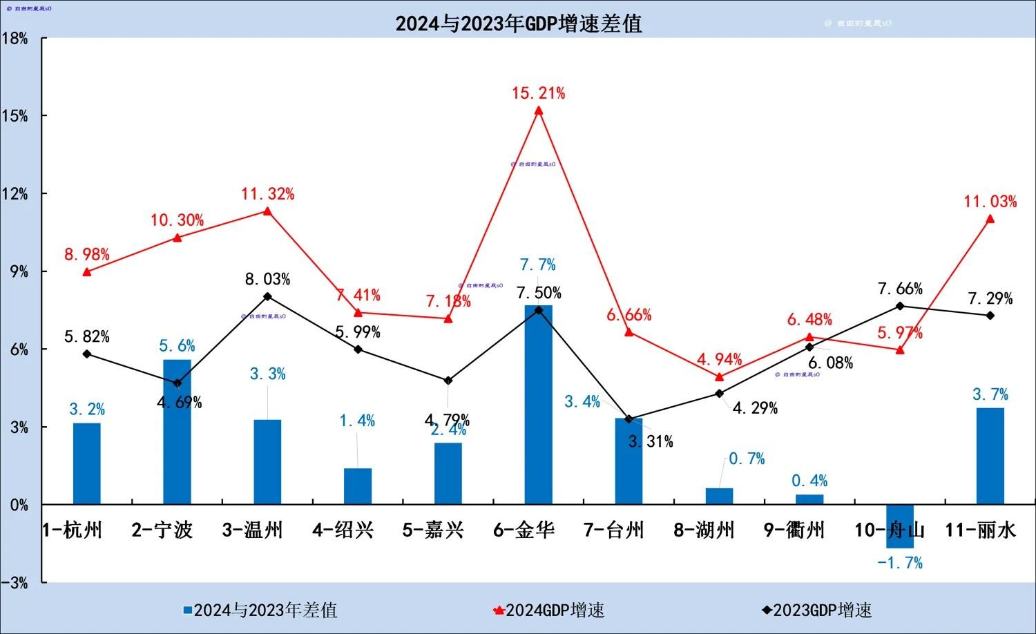 1、对比2023年同期,金华经济发展速度加快7.7个百分点,翻出一倍还要多,实在令人称奇道绝。宁波紧随其后,也同比加快5.6个百分点。杭州、温州、台州、丽水四市也不甘落后,2024年经济发展加快速度也在3个百分点以上,依次是3.2个、3.3个、3.4个、3.7个百分点。