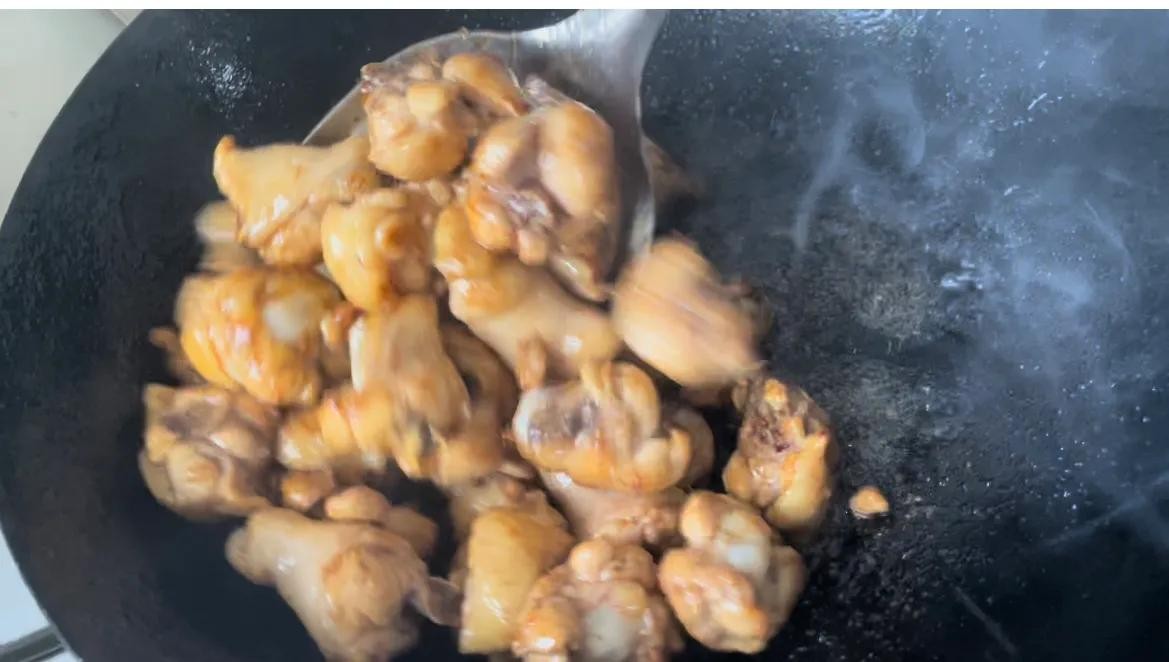 温馨提醒:刚才捞出的鸡腿控干水分,如果没控干,倒锅里的时候注意迸溅。