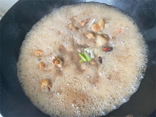 鸡块翻炒到两边金黄时接着倒入葱段一起再炒一分钟。然后加入没过鸡腿的开水,然后再分别倒入6勺生抽几个八角。