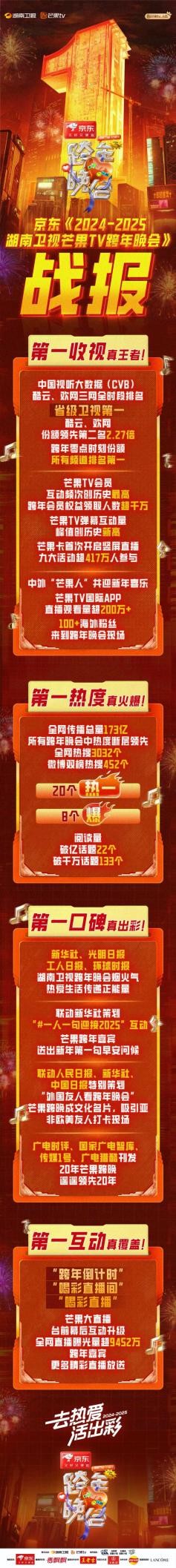 当2025新年时刻已到来,2024最后一抹余晖跨过零点持久发酵。在这个辞旧迎新的晚上,《2024-2025湖南卫视芒果TV跨年晚会》以绝对的王者之姿,毫无悬念地成为全网瞩目的焦点:收视三网第一,中国视听大数据(CVB)、酷云、欢网三网全时段排名省级卫视第一!中国视听大数据(CVB)份额领先第二名2.28倍;酷云、欢网份额领先第二名2.27倍,跨年零点时刻份额所有频道排名第一。