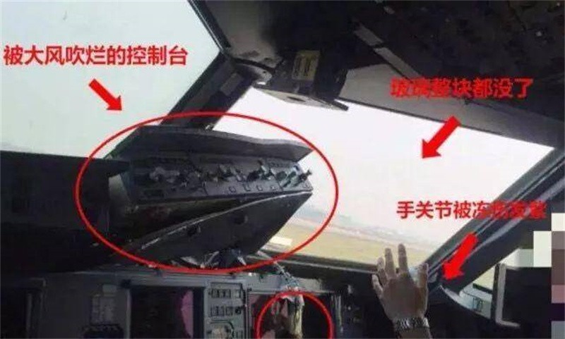 一瞬之间,副驾驶半个身子都被吸出窗外,驾驶室门被吹开,乘务员和乘客被吹得东倒西歪,飞机发生剧烈震颤,眼看就要失去控制。