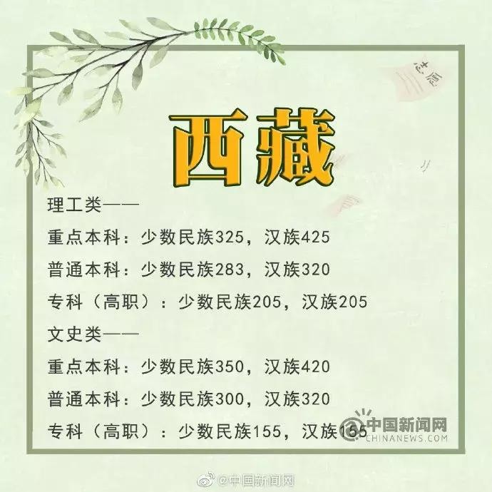 西藏:重点本科文科少数民族350分,汉族420分;理科少数民族325分,汉族425分
