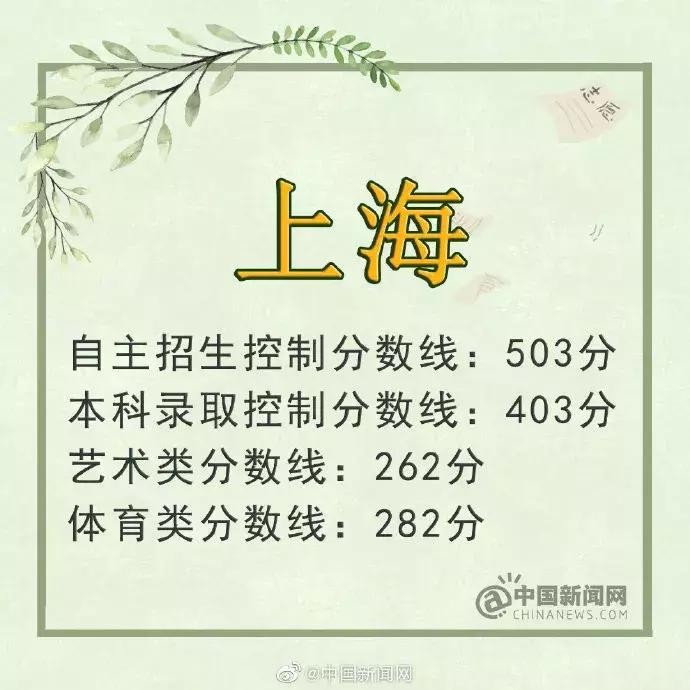 据上海教育考试院网站消息,6月23日,上海2019年高考分数线公布:本科录取控制分数线403分、自主招生控制分数线503分。艺术类本科文化控制分数线:262分;体育类本科文化控制分数线:282分。