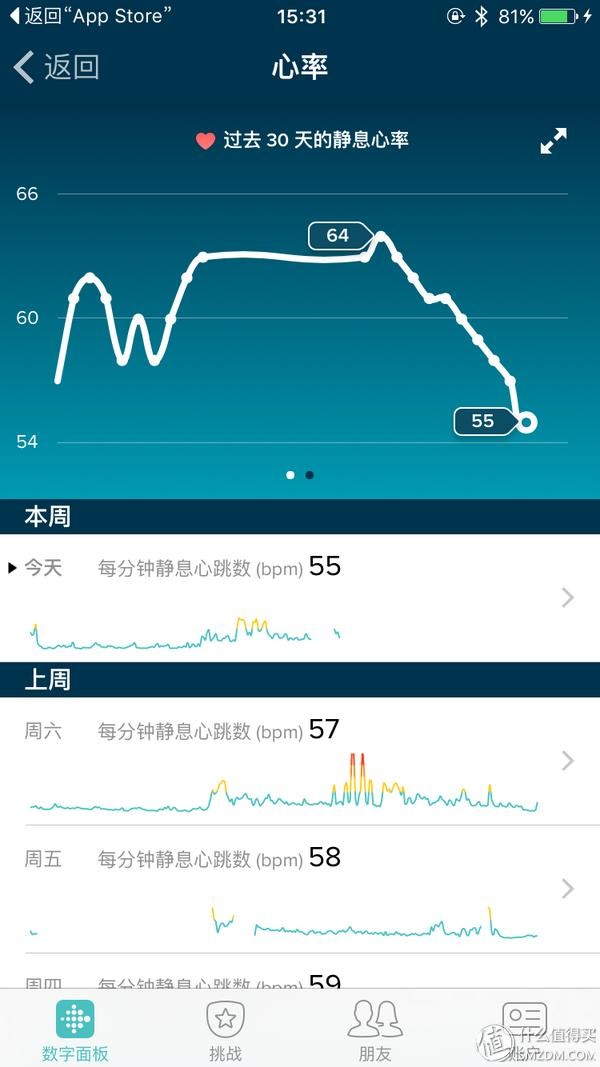 主要是显示当前心率、步数、公里数、爬楼数、卡路里、活跃时间等,还包括体重目标、睡眠目标等。目标如果达成,进度条是绿色的,否则是红色的。上面这张图我专门找了一个达到目标的日子截了图。