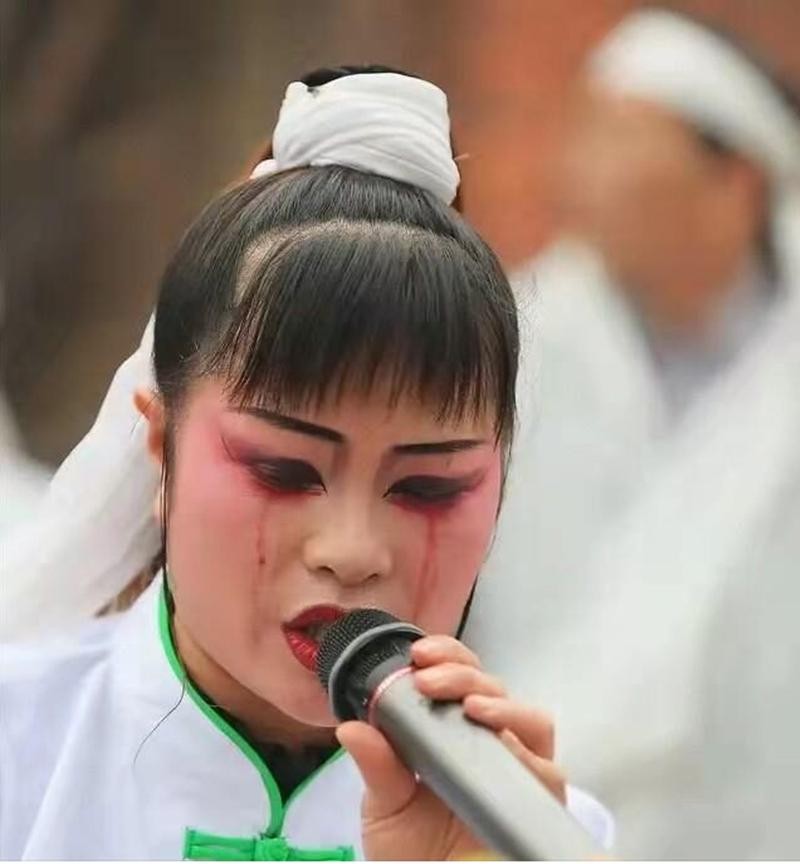 在一户农家,正在举行丧葬仪式,一位女子身着白衣,脸上画着夸张甚至有些吓人的血泪妆,她正卖力的哭着,边哭边讲述死者的生平事迹。