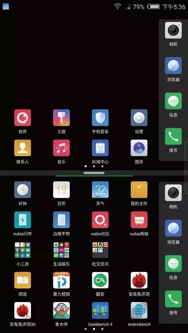 值得一提的是,nubia UI5.0中还搭载了一个全局分屏的功能,不同于那些需要应用本身支持分屏才能实现分屏的系统,努比亚直接将分屏功能做成了类似两个桌面的形式,在一个桌面上打开任何应用都不会影响另外一边,你甚至还可以在Z17上双开手游!