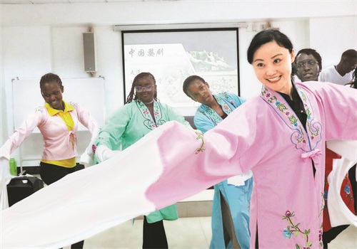 2023年9月,杨霞云为肯尼亚内罗毕大学的学生们展示婺剧身段。受访者供图