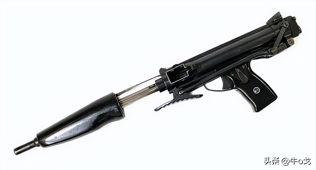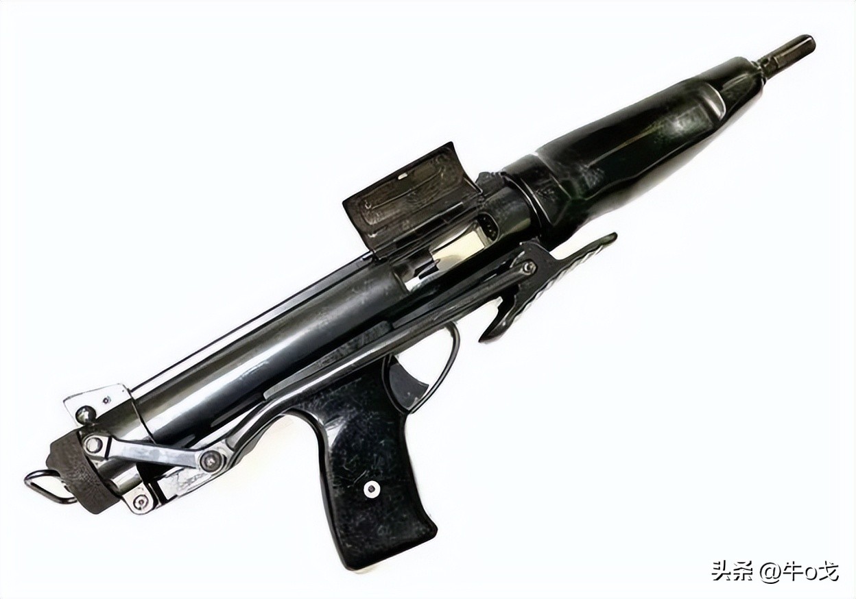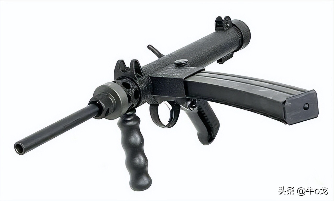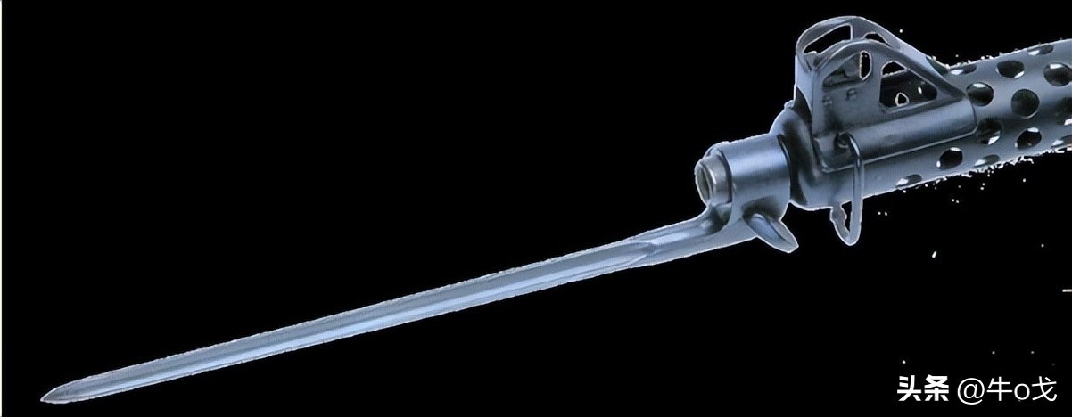 冲锋枪上装刺刀不多见,但也有过,该枪配刺刀算不上新创,但其不用时的收折方式有点新意。