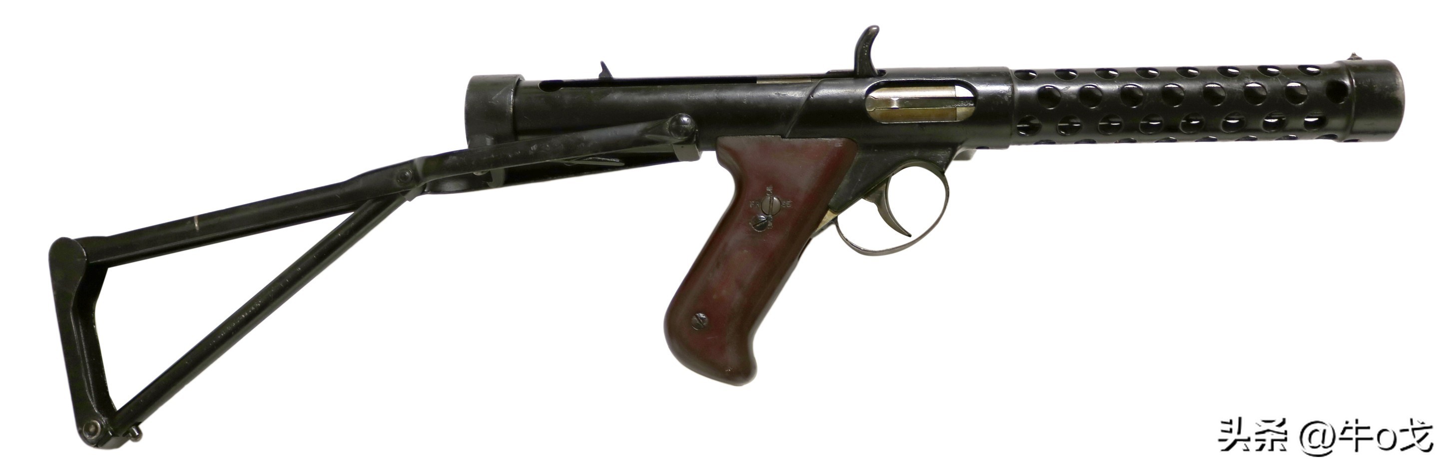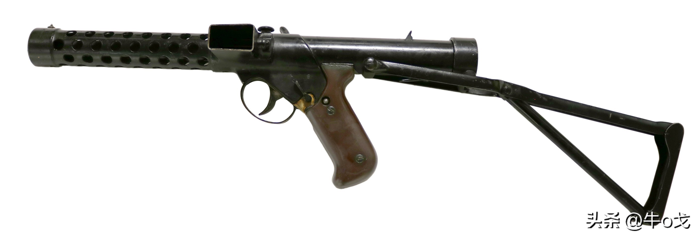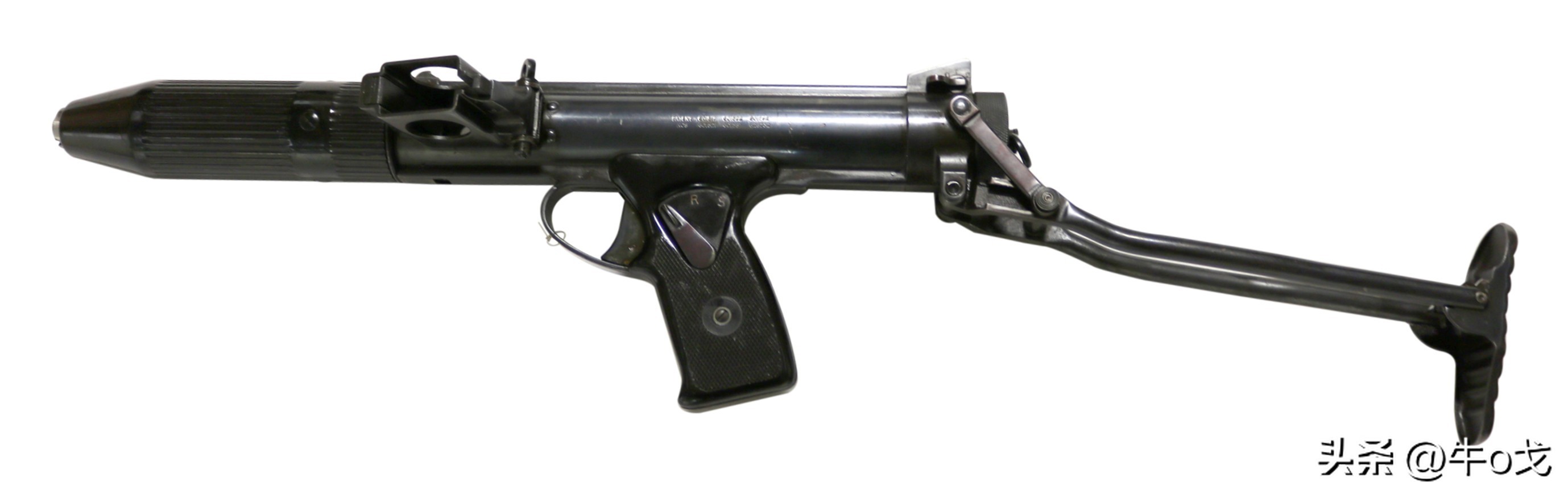 冲锋枪上装刺刀不多见,但也有过,该枪配刺刀算不上新创,但其不用时的收折方式有点新意。