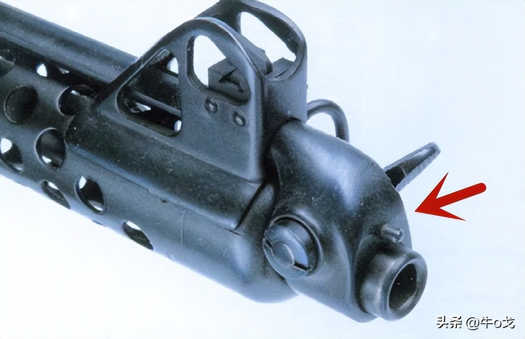 图中箭头指处,就是反向收折于枪身上的刺刀。是通过准星下的一个孔洞插入,刺刀尾部与枪管扣合,浑然一体。如果不经提示,很难看出那里藏着一把刺刀。