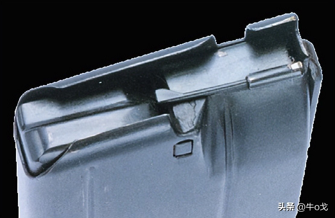 这是V-42冲锋枪的弹匣。看上去很宽。弹匣口有一个杆状零件,与供弹切换杆配合动作,打完一个弹匣,自动切换到另一个弹匣,保证60发供弹不间断。