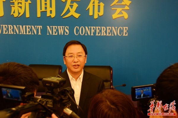 新闻发布会结束后,长沙市政府秘书长谭勇被记者团团围住。记者 龙腾 摄