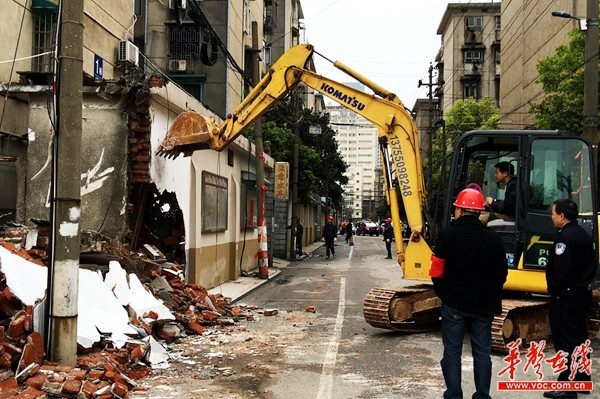 图为陈家湖江南苑1栋西侧围墙提质改造拆除中。资料图
