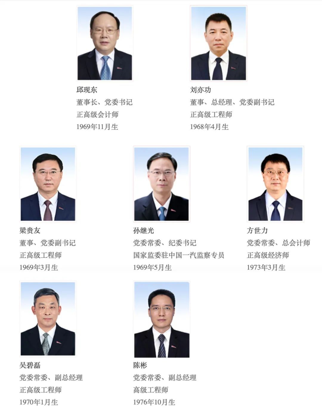 公司官方网站的“领导成员”和“董事会”中已经更新这一变化,梁贵友以中国一汽董事、党委副书记的身份,在领导成员、董事会中均排名第三,是央企的专司党建的专职党委副书记。